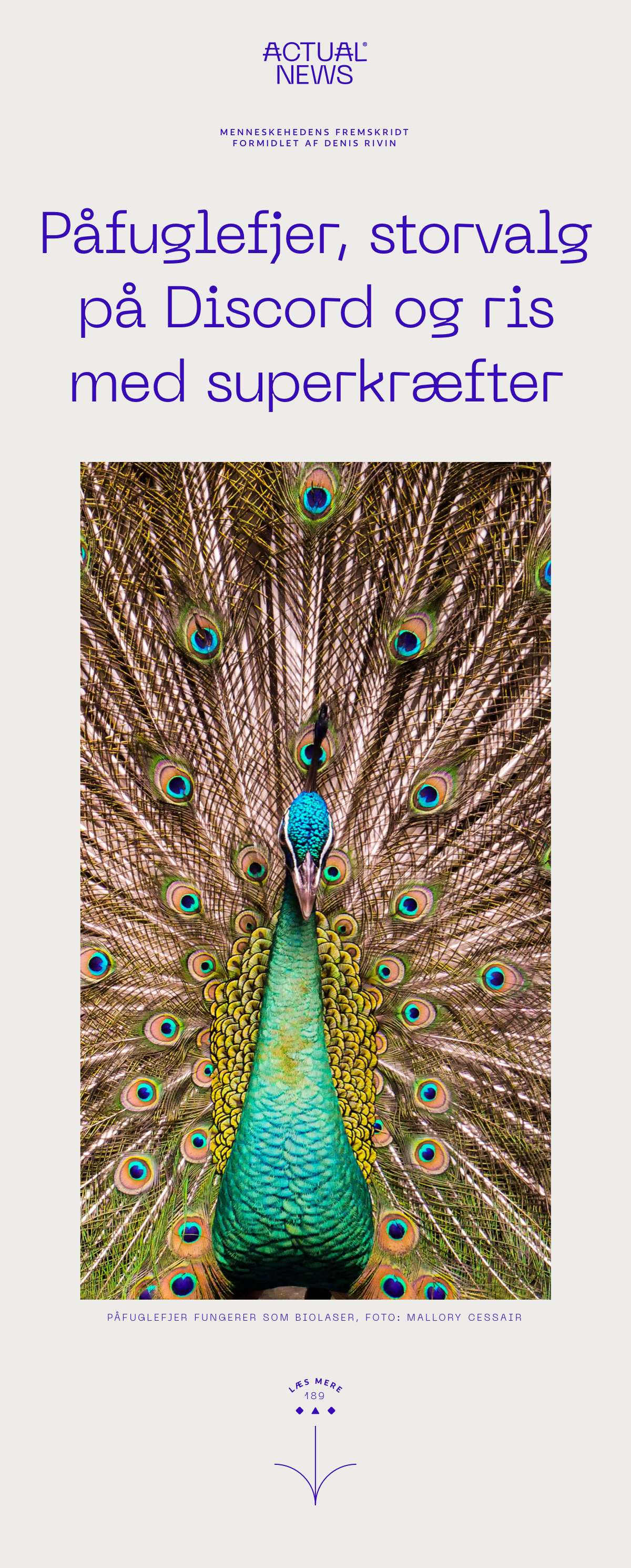Naturlig nanotech: Et internationalt forskerhold har påvist at påfuglefjer kan forstærke og udsende laserstråler når de behandles med bestemte farvestoffer – hvilket gør dem til den første dokumenterede biolaser i dyreriget. Konkret: Det særlige ved påfuglefjer er at deres farver ikke stammer fra pigment, men fra nanostrukturer af keratin og melanin, der fungerer som fotoniske krystaller. Disse krystaller kan styre og manipulere lys på samme måde som avancerede materialer i moderne teknologi. Og hvad så? Opdagelsen åbner døren for udvikling af biolasere der en dag kan bruges til alt fra medicinsk billeddannelse til sensorer i kroppen. Laserfænomener er tidligere set i alt fra koraller til menneskeligt væv, men det her er første gang at forskere finder laseregenskaber i et dyr.