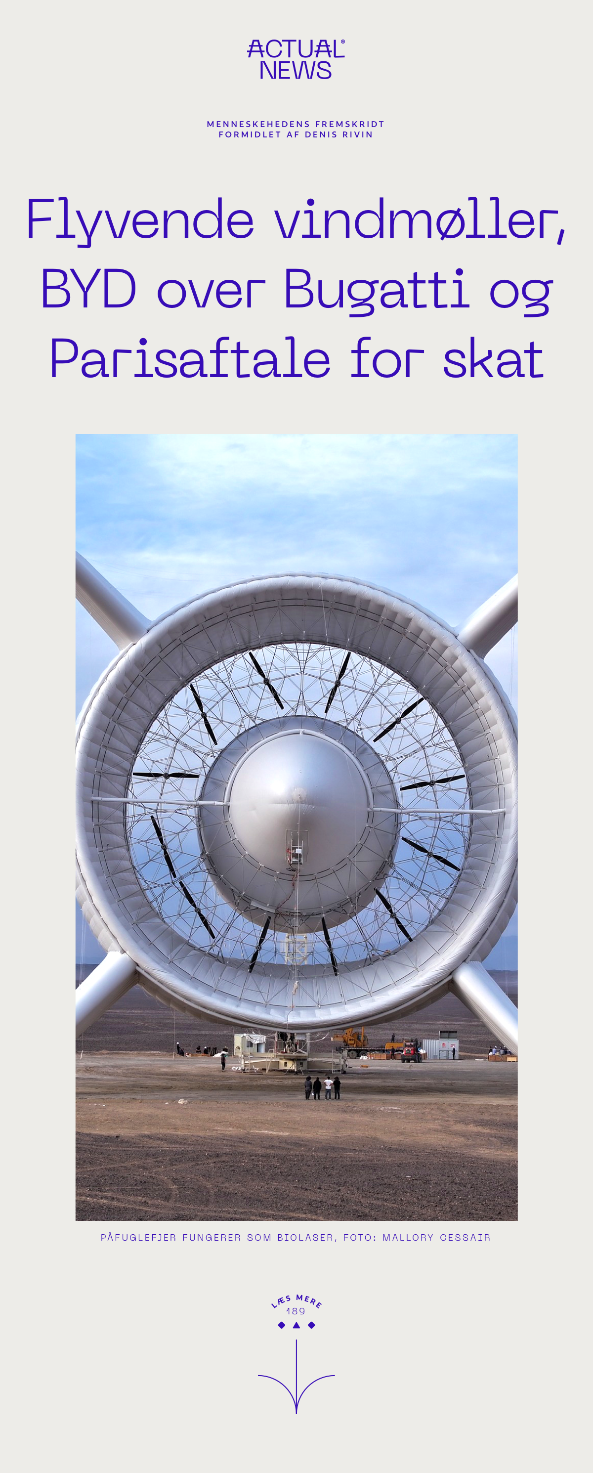 Flyvende vindmøller: En 13 etager høj luftskibslignende vindmølle på størrelse med en basketballbane, designet til at svæve i 1000 meters højde og høste strøm fra kraftige, konstante vinde – det er præcis hvad ingeniører eksperimenterer med i Hami-ørkenen i det vestlige Kina. Konkret: Den flyvende vindmølle rummer 12 turbiner á 100 kW og fungerer som en svævende powerbank til katastrofehjælp, ø-samfund og minedrift i afsides områder. I vanlig kinesisk innovationstempo er den skaleret fra 50 kW til 1 MW på under et år og forventes sat i produktion i 2026. Og hvad så: Traditionelle vindmøller er i årtier blevet billigere, bedre og meget, meget større, men alene fundamentet til de største af dem kræver enorme mængder stål og cement. Det er ikke bæredygtigt i længden og al tænkelig innovation er kærkommen.