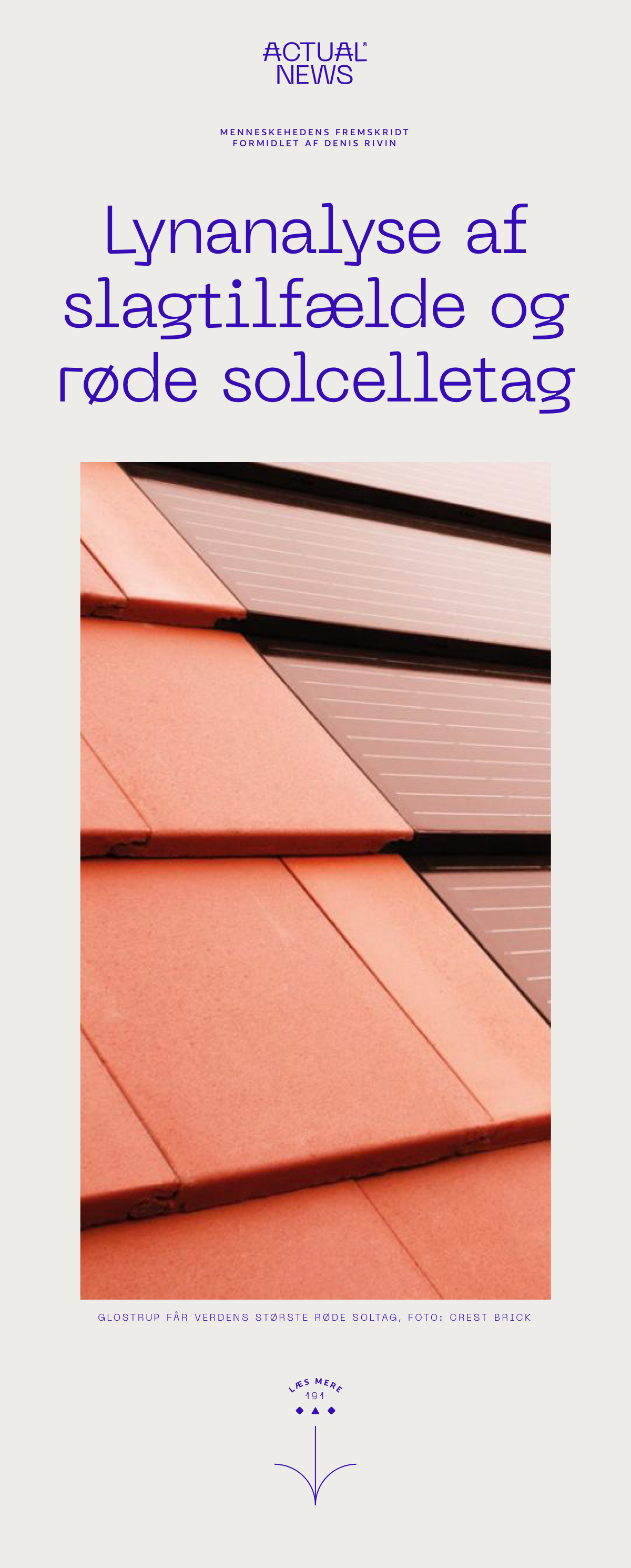 Verdens største soltag: Vedvarende energi og arkitektoniske hensyn flettes sammen på smukkeste vis i Glostrup hvor otte boligblokke i Glostrup Vestergård får opført verdens største røde solcelletag, nu hvor taget alligevel skulle udskiftes (tak for tippet til Magnus Petersen-Paaske). Og hvad så? Projektet, på ca. 6500 m², kombinerer nødvendig renovering med bæredygtig teknologi og sender et tydeligt signal om at selv almene boligbyggerier kan blive frontløbere i den grønne omstilling. Perspektiv: Danmarks Almene Boliger har beregnet at de almene boliger i Danmark har tagarealer svarende til ca. 20 km2 i alt – eller et område lidt mindre end Roskilde by. Benyttes bare 25% af arealet til solceller vil de almene boliger kunne bidrage med en halv gigawatt solenergi – eller det der svarer til en halv atomreaktor.