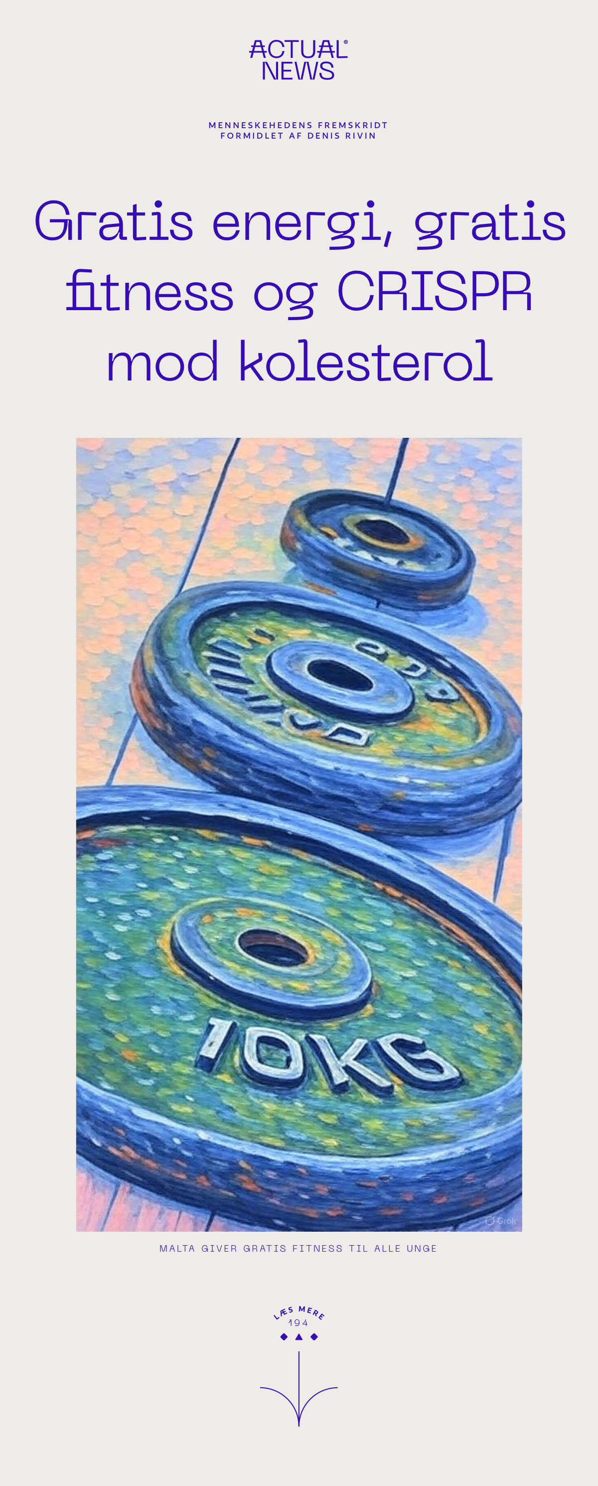 Gratis fitness: Alle maltesere mellem 16 og 21 år får fremover seks måneders gratis medlemskab i et valgfrit fitnesscenter. Ikke nok med det: Tiltaget kommer som del af en større pakke i årets finanslov med forhøjede studiestipendier, øget boligstøtte, støtte til digitale læringsmidler og op mod €5000 om året i fem år til unge op til 30 år der vælger ikke at få kørekort. Perspektiv: Maltas premierminister, Robert Abela, er tidligere bodybuilder, tjek, og landet lider under luftforurening med flest biler pr. indbygger i hele EU, tjek og tjek. Tiltagene giver sindssygt god mening, men er så snusfornuftige at det føles helt fishy... Skulle de ikke ringe til Dansk Erhverv og få et rigtigt råd om folkesundhed?