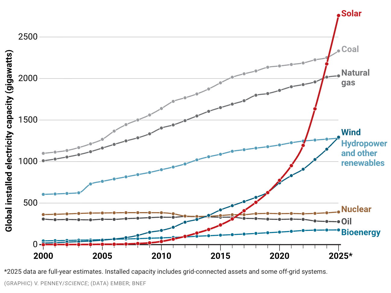 Breakthrough of the Year: Det videnskabelige tidsskrift Science har kåret vedvarende energi som Breakthrough of the Year 2025, da sol- og vindenergi definitivt er rykket fra ideologi til hård realøkonomi. Konkret: I første halvår af 2025 voksede sol og vind så hurtigt at de dækkede hele stigningen i verdens elforbrug – og samtidig satte kulkraft til vægs: Bladr blot igennem tidligere nyhedsbreve for at få det bekræftet. Og hvad så? Kåringen sker på baggrund af en strukturel ændring i verden hvor lavere priser og fokus på energisikkerhed har skabt en selvforstærkende spiral: Voksende efterspørgsel på vedvarende energi → mere produktion → lavere pris → voksende efterspørgsel 👇