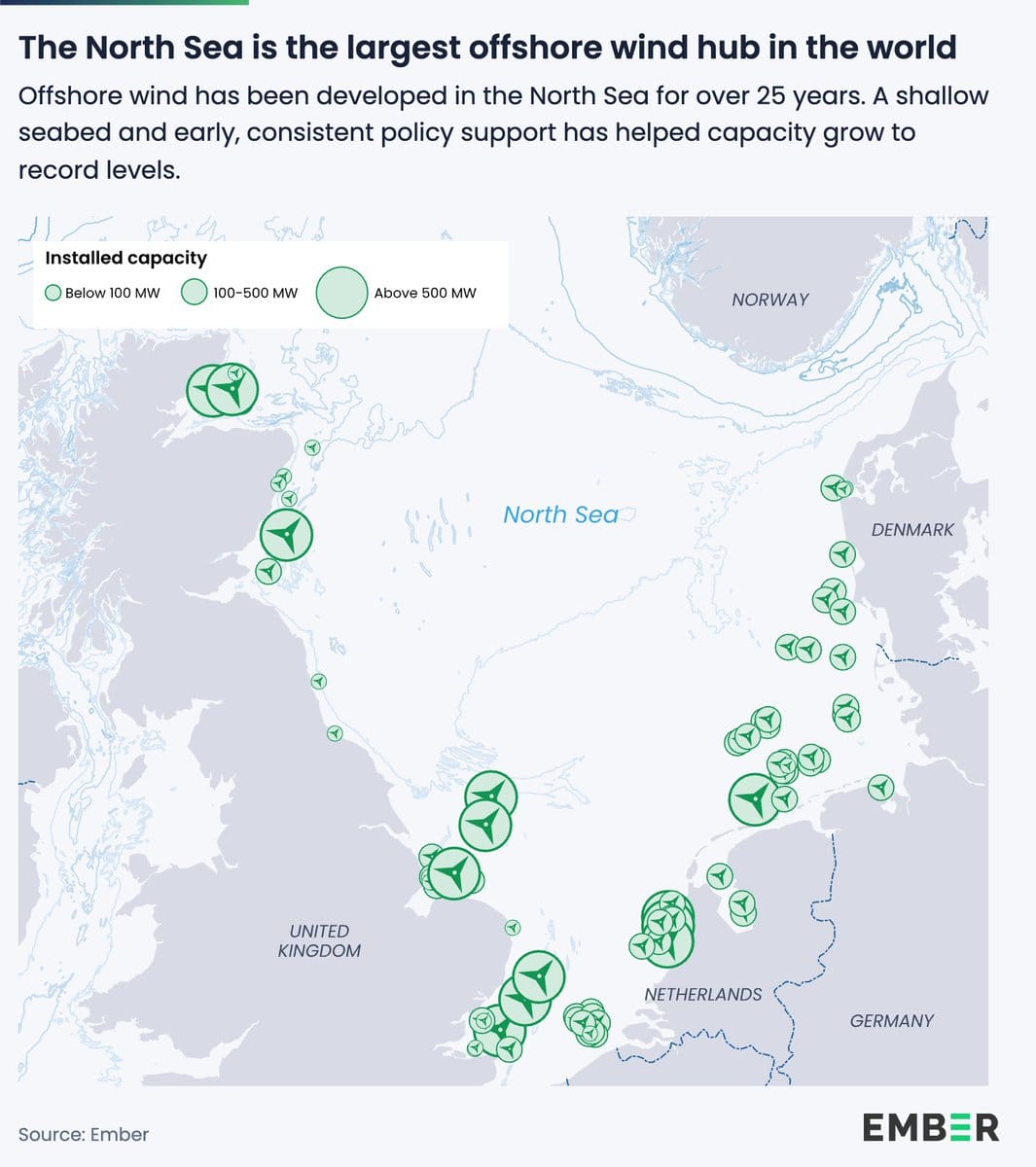 Europa optrapper vindkraft: Ti europæiske lande, inkl. Danmark, har indgået en politisk aftale om at mere end tredoble Nordsøens nuværende havvindkapacitet – fra 30 GW til 100 GW. Møllerne forventes at generere strøm nok til mindst 100 millioner husstande og reducere elpriserne med op mod 30% frem mod 2040. Perspektiv: Det er en anlægsopgave af gigantilopiske dimensioner, og byggeriet forventes at tage mindst et årti. Men i Kina sætter man ca. samme mængde vindkraft op på et enkelt år. Vidste du? Nordsøen er i forvejen verdens mest udbyggede havområde for havvind: Området har pt 101 aktive havvindmølleparker, og fire af verdens fem største er her 👇